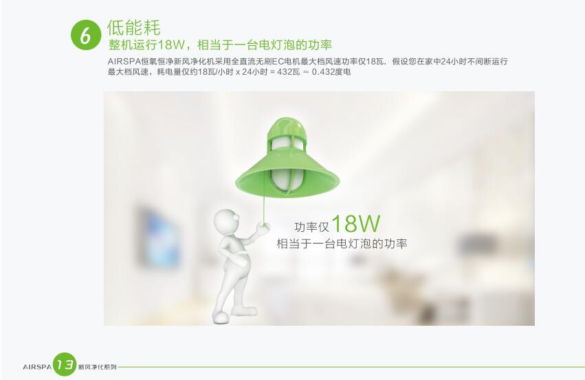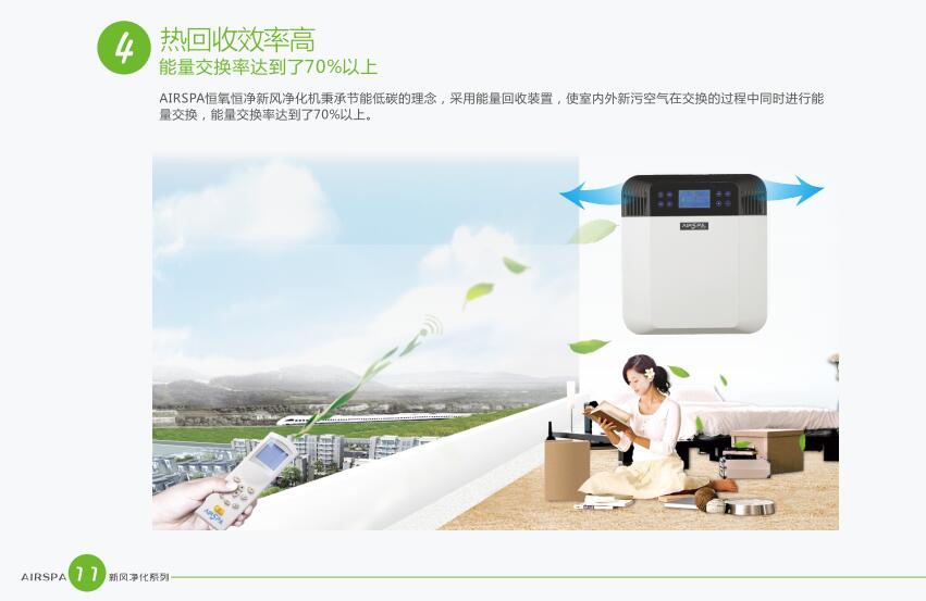 AIRSPA恒氧恒凈新風(fēng)凈化機(jī)秉承節(jié)能低碳的理念,采用能量回收裝置,是室內(nèi)外新污空氣在交換的過程中同時(shí)進(jìn)行能量交換,能量交換率達(dá)到了70%以上。