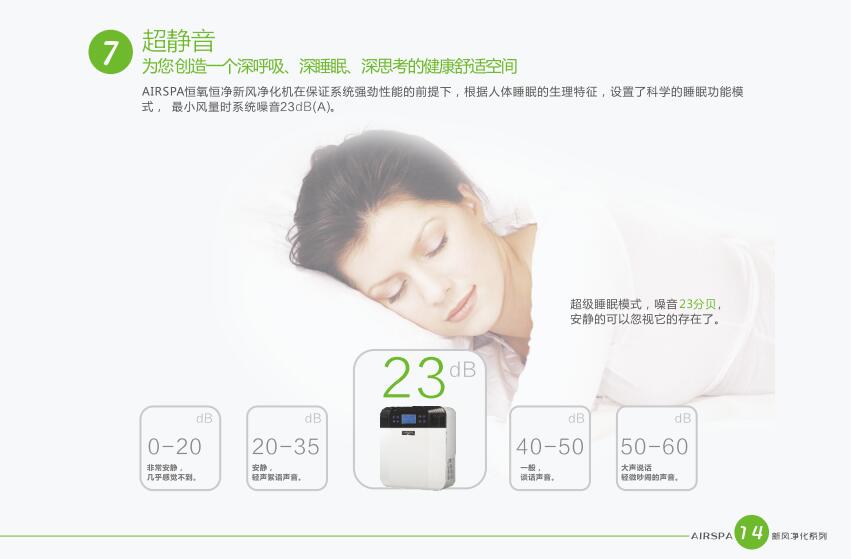 AIRSPA恒氧恒凈新風(fēng)凈化機(jī)在保證系統(tǒng)強(qiáng)勁性能的前提下、根據(jù)人體睡眠的生理特征、設(shè)置了科學(xué)的睡眠功能模式,在此模式下、系統(tǒng)噪音最低只有23Db(A)